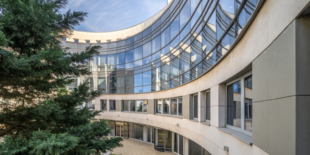 The neoclassical office building at 100 Andrássy avenue was built in 1890 and served as the residence of the Prime Minister, then as a trade union headquarters and a confectionery school. In 1999, during renovations a modern wing was added. The classical and modern office wings are connected on each floor, with a double-height atrium on the ground floor covered by a glass roof.